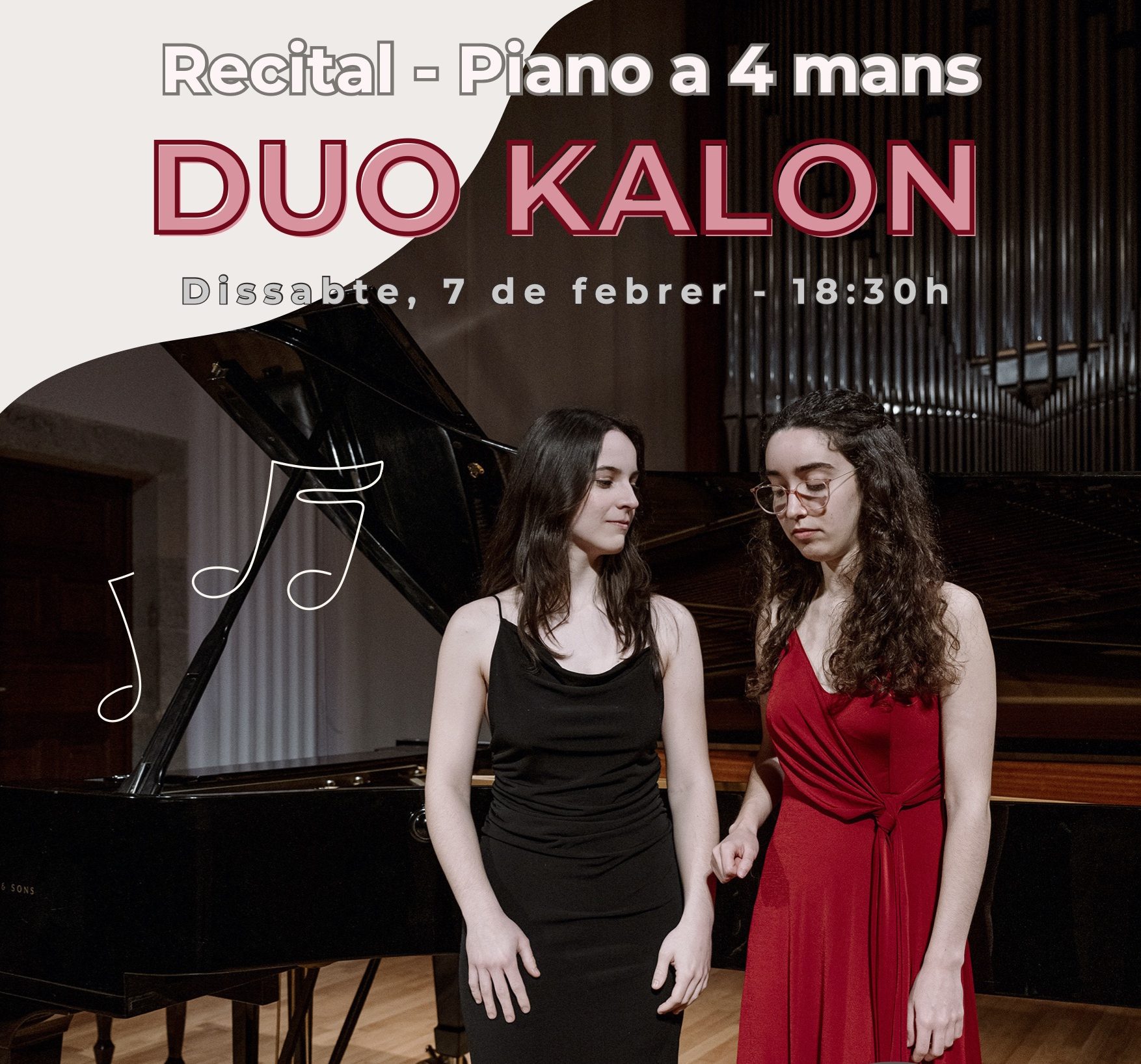 El Duo Kalon ha estat guanyador al 2025 del Xè Concurs Internacional de Piano “Gran Klavier ” Ciudad de Alcalà i el premi al millor Duo de Música de Cambra Isolda-Asociación Cultural Gran Klavier. El Duo està format per les pianistes Carmen Vilanova i Alba Linares. En aquest Concert interpretaran obres de Francis Poulenc, Maurice Ravel, Claude Debussy, Albert Guinovart, Enric Granados i Manuel de Falla.